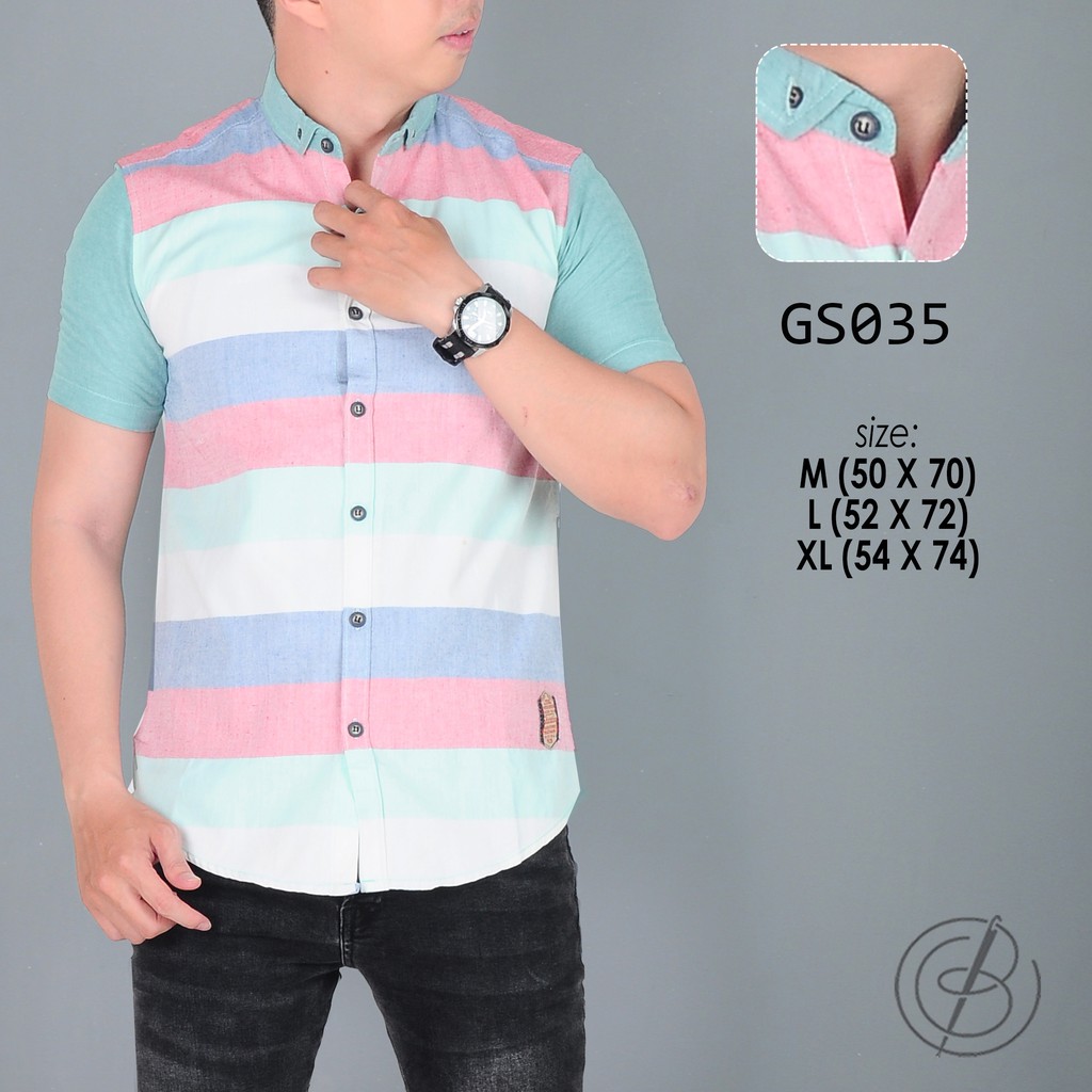 Kemeja Lengan Pendek Pria Bergaris Salur Warna Pastel Pink Tosca